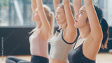 Young diversity sporty people practicing yoga lesson with instructor. Multi racial group of women exercising healthy lifestyle in fitness studio. Sport activity, gymnastics or ballet dancing class.