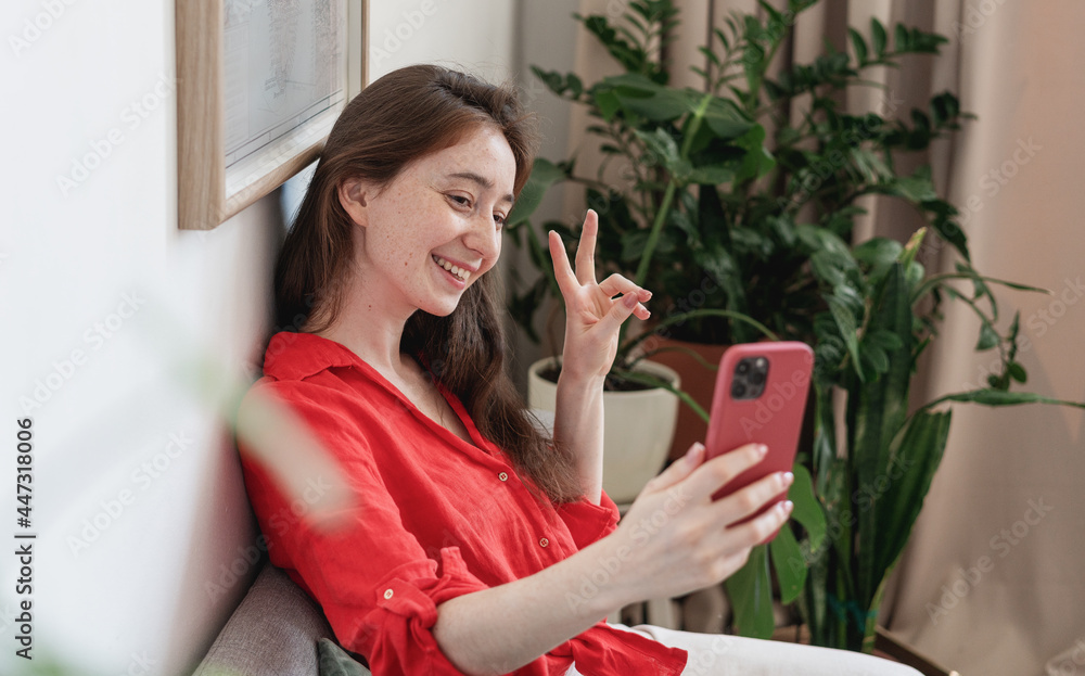 Beautiful young happy woman brunette girl in red blouse sitting at home using smartphone for video chats