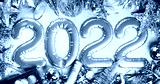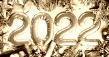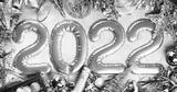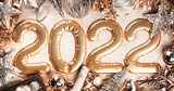 Happy New Year 2022 golden foil balloons with various rich festive ornaments baubles decor and sparkling wine bottle. Monochrome banner