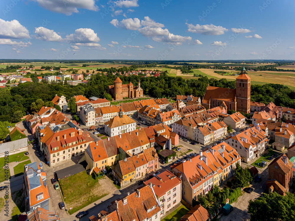 Panorama of the city of Reszel - Castle and the Church of Saint Apostles Peter and Paul in Reszel, town hall and buildings with red roofs