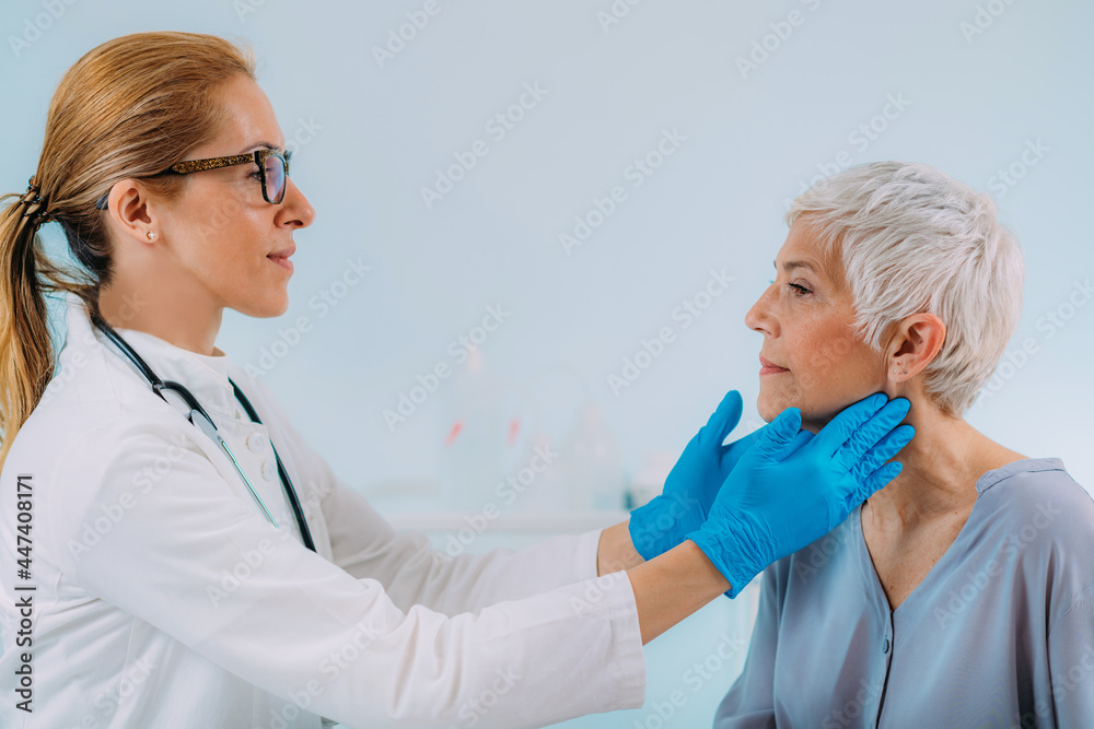 Doctor Examining a Senior Woman with Thyroid Gland Disease Symptoms