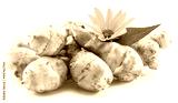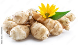 Jerusalem artichoke roots with leaves and flower of Jerusalem artichoke isolated on white background.