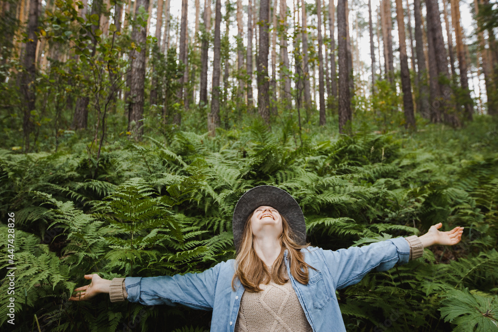 Positive female with outstretched hands in abundant fern growing in woods with tall pines