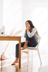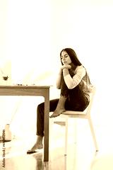 A student girl rests with her eyes closed, resting her head on her knees, while preparing for lectures or exams