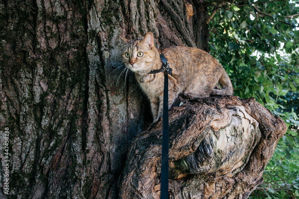Cat in a collar on a leash climbs a tree in nature in the park.