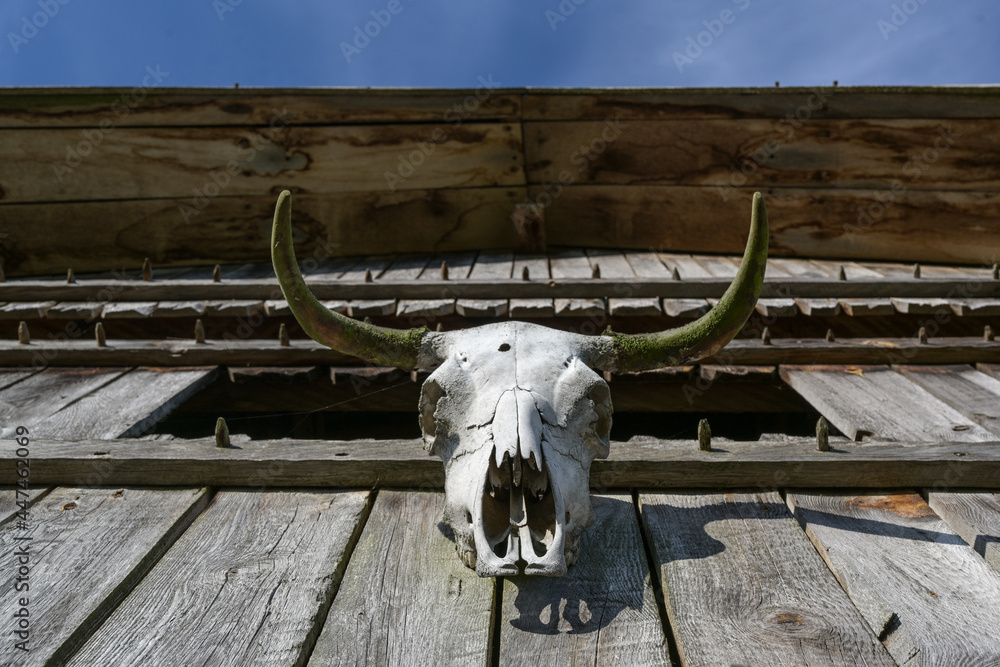 cattle skull hangs on a wooden wall of an historic viking house, selected focus,