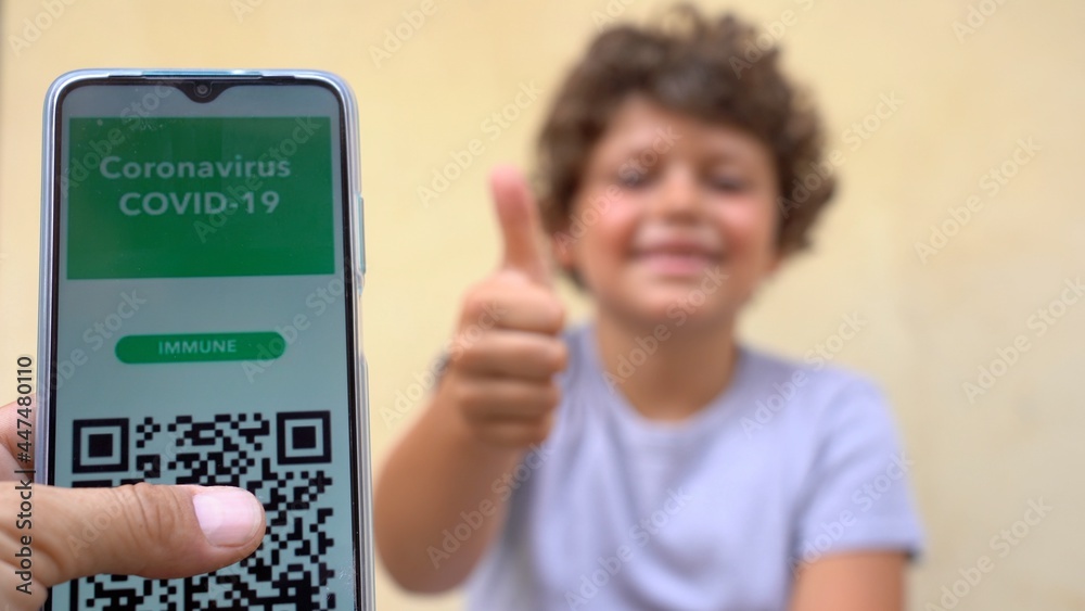 Europe, Italy , Green Pass European Eu Digital Covid-19 Coronavirus passport Certificate to travel - boy 7 years old ready to go on a trip with screenshots of the vaccination