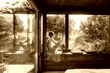 Young woman resting at beautiful country house or hotel, sitting on the window sill enjoying beautiful view on pine forest. Concept of solitude and recreation on nature
