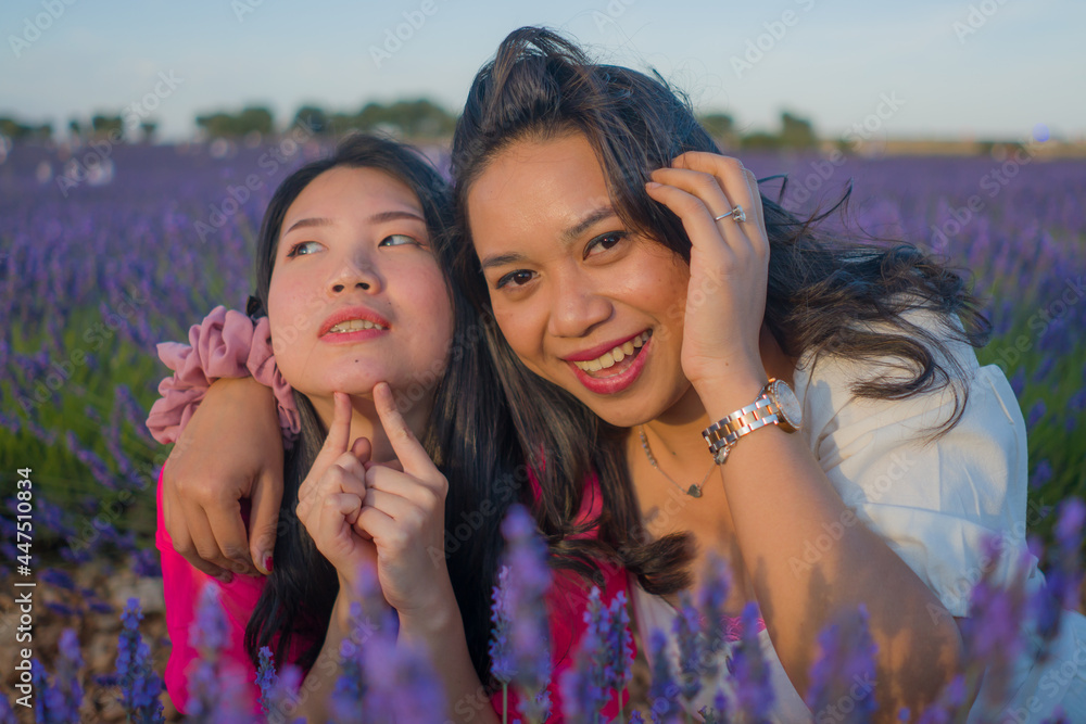 young happy and beautiful Asian korean woman playing on lavender flowers field with her hispanic girlfriend enjoying sweet holidays together relaxed and carefree