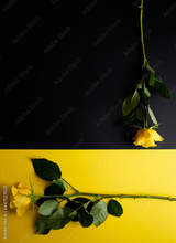 Yellow rose on trendy black and yellow colour block geometric background. Fashionable template in flat lay style with place for your text. Minimal mockup concept.