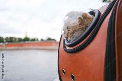 Close-up of a cat sitting in a backpack with a porthole overlooking the city embankment.