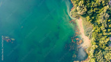 Aerial landscape photography. Aerial top down view of beautiful green waters of lake.