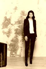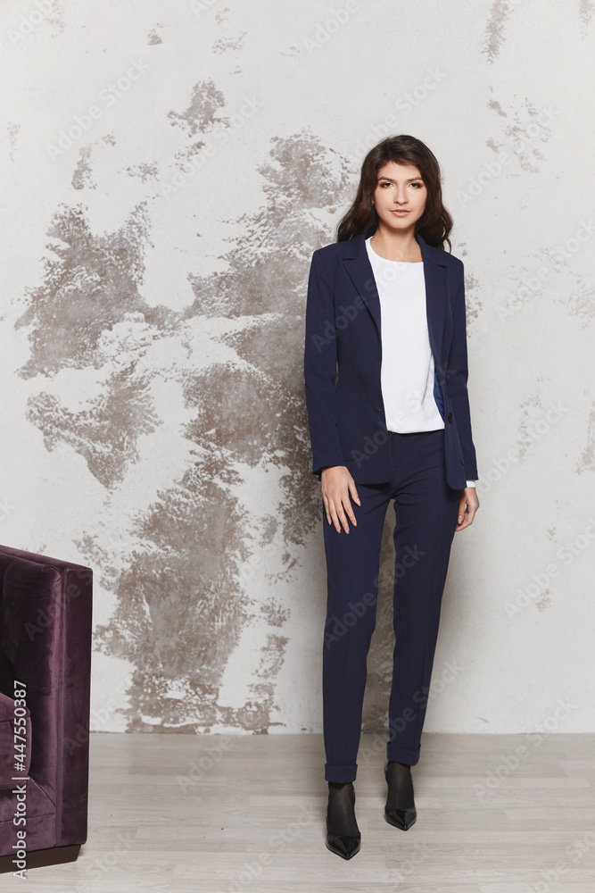 Young business lady in a stylish blue suit and white blouse. Business fashion concept