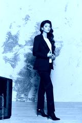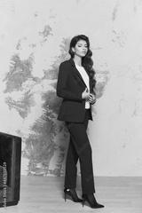 A confident model girl with long beautiful hair in a stylish blue suit and white blouse. Business fashion concept