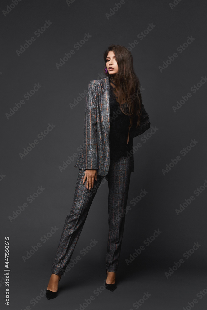 Full-length portrait of a confident model girl in a modish checkered suit on the grey background, business fashion concept