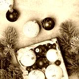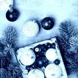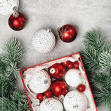 Red and white Christmas baubles in a gift box with green Christmas tree branches flat lay. Merry Christmas and Happy New Year seasons greetings card. Copy space
