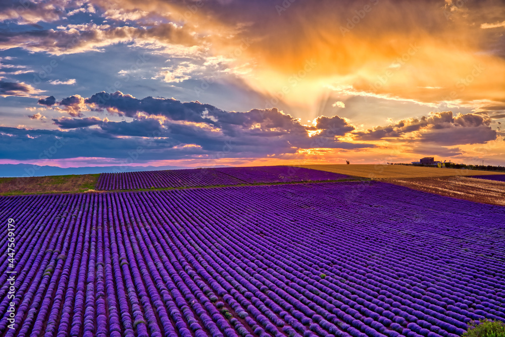 Blooming lavender at sunset create a stunningly beautiful landscape