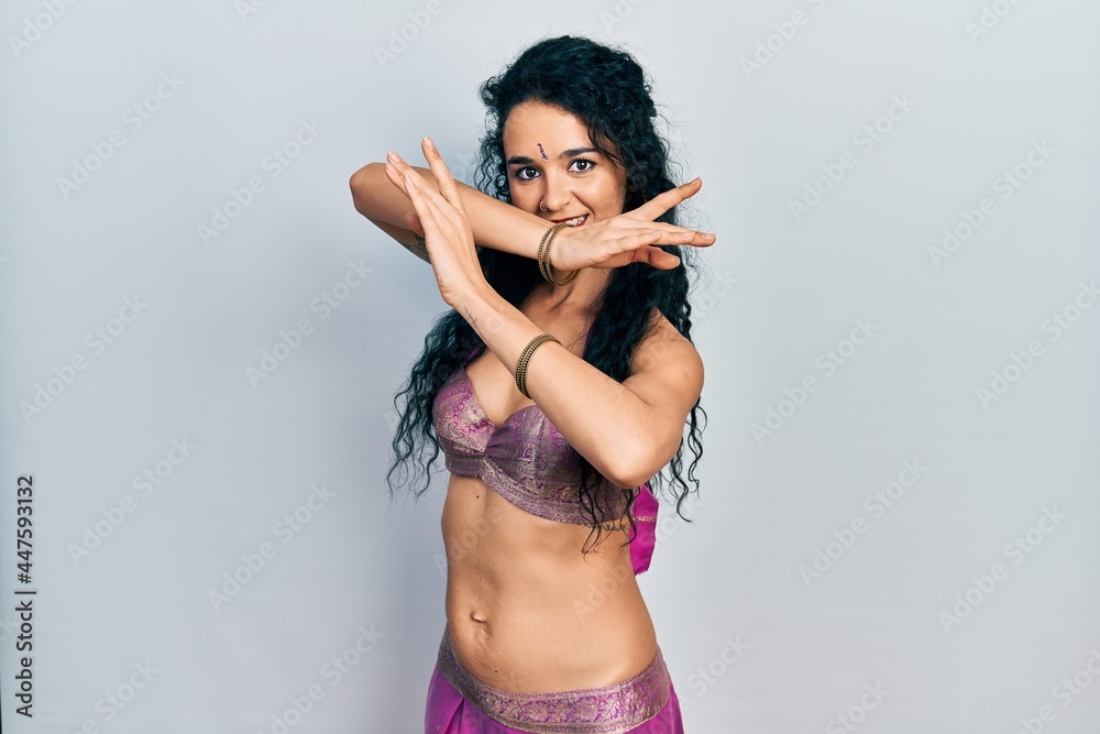 Young indian woman wearing traditional belly dancer costume. Dancing exotic oriental dance with body and hands