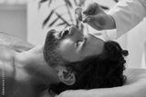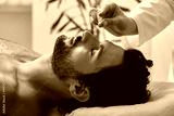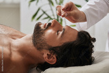Acupuncturist inserts acupuncture needles into acupuncture point on male head for headaches. Traditional chinese medicine, reflexology