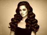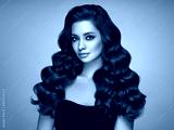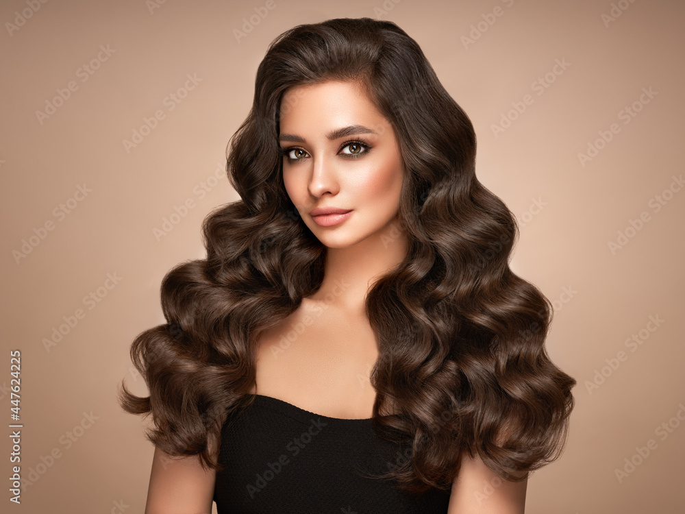Brunette girl with perfect makeup. Smiling beautiful model woman with long curly hairstyle. Care and beauty hair products