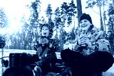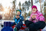 Two cute adorable beautiful caucasian little siblings children boy girl enjoy drinking warm drink tea or chocolate in paper cup and eat on bright sunny winter morning forest family picnic outside