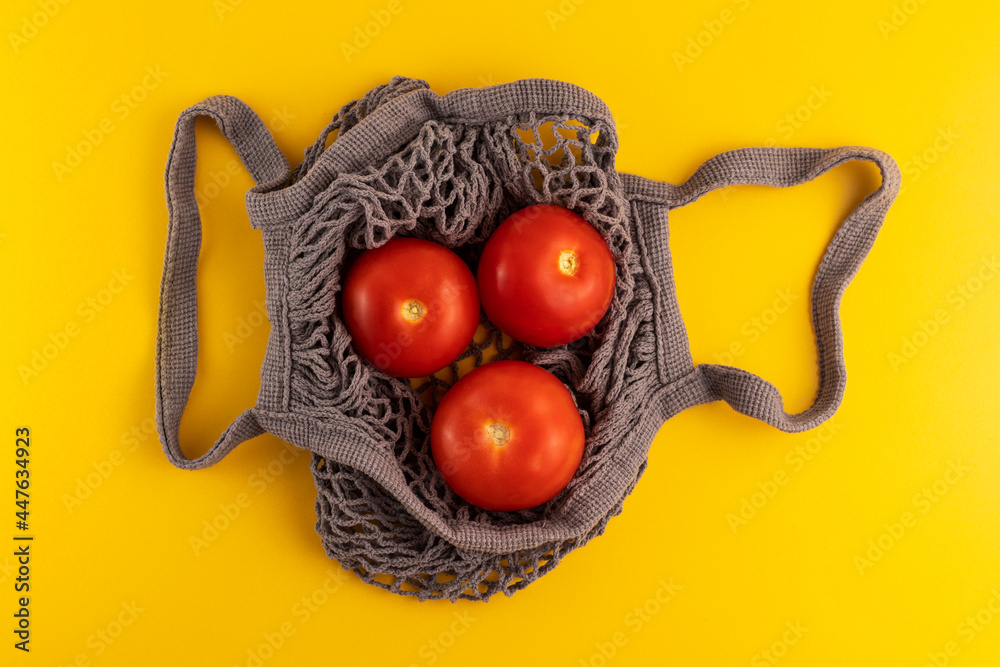 Gray string shopping bag with tomatoes. Top view. On a yellow background.