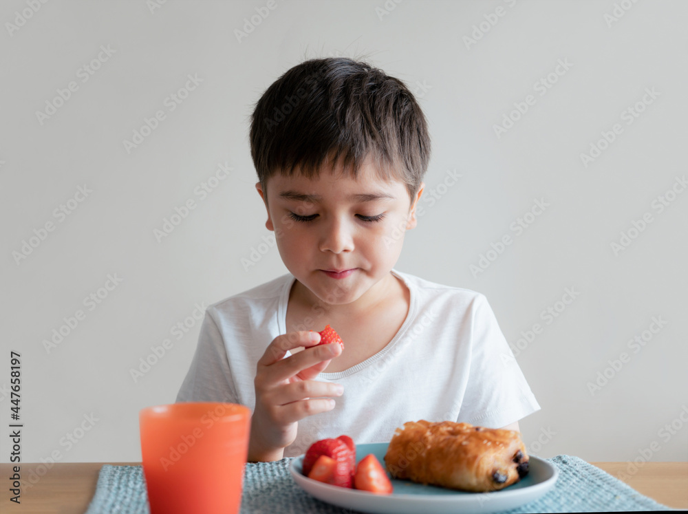 Healthy kid eating strawberry and chocolate croissant, Portrait boy having breakfast, Child eating healhty food at home.