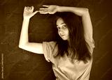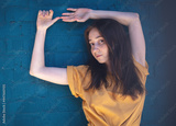Beautiful young brunette woman in a yellow t-shirt on a background of a blue brick wall
