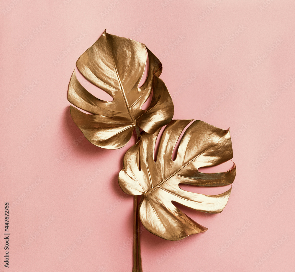 Natural luxury still life. Golden monstera leaves on pastel pink background. Minimal fine art creative concept. Flat lay design. Trendy exotic tropical botany wallpaper.