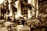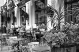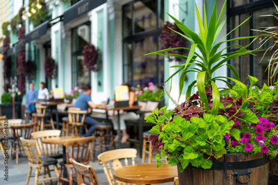 The interior of a summer street cafe. Bright sunny day in the city.