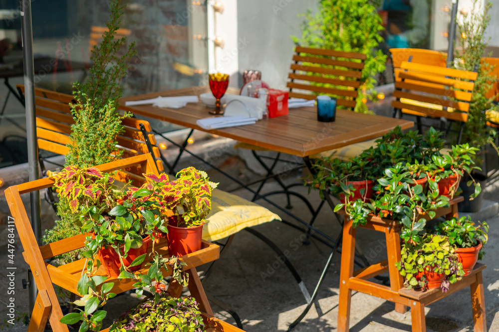 The interior of a summer street cafe. Bright sunny day in the city.