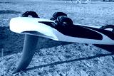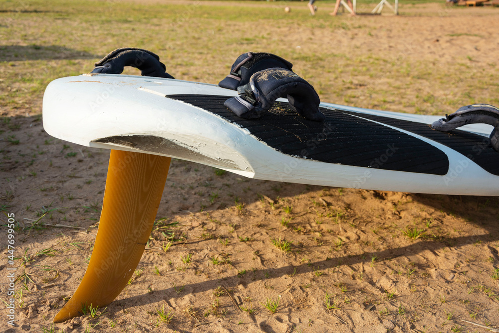 Surf board lies on the sand on the beach on the shore of the lake, sea, water sports, active lifestyle, vacation, heat, rest