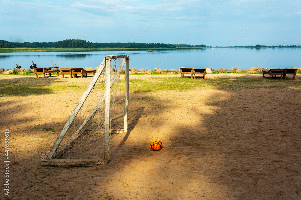 Soccer goal and ball on the beach. Sunlight, water and sand. The beach on the lake of the tourist base.