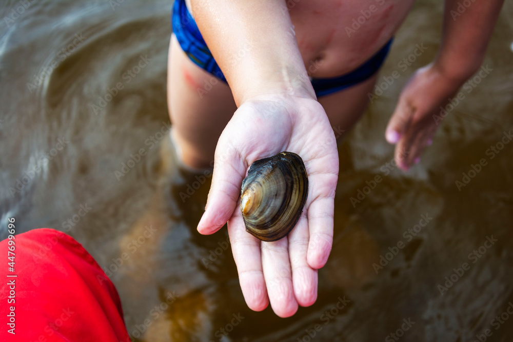 lake shell on a child's hand, freshwater clam, aquatic inhabitants