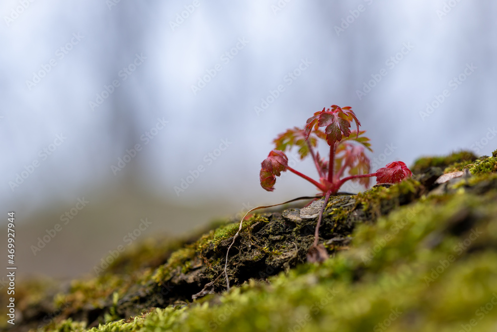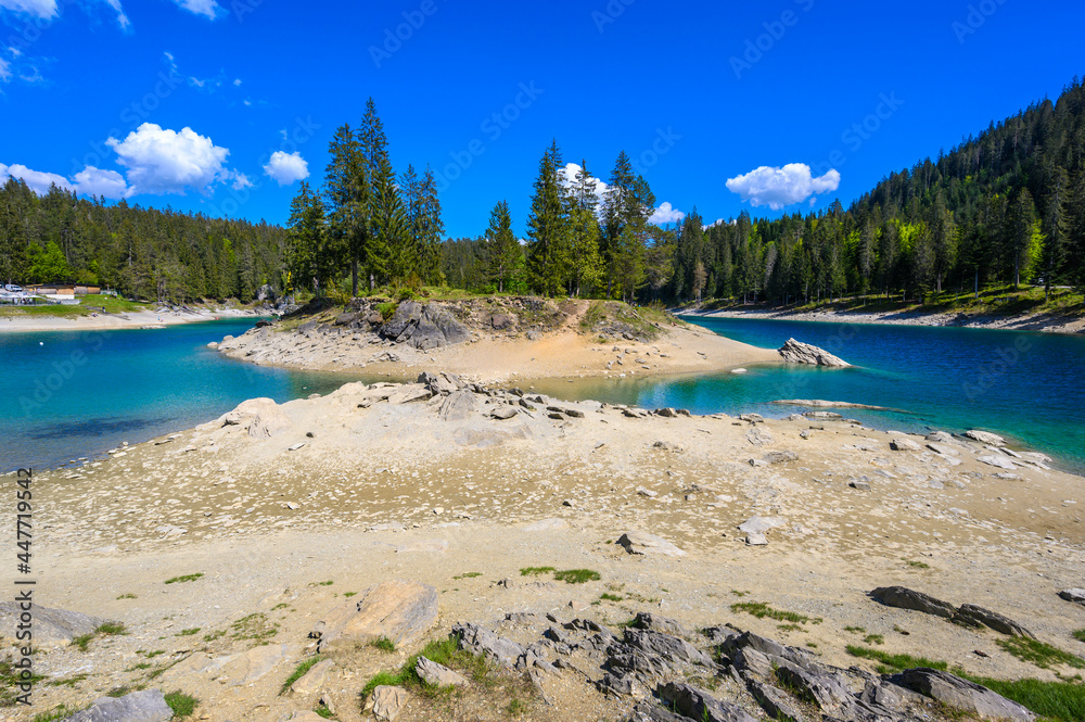 Small island in the middle of Cauma Lake (Caumasee) with crystal blue water in beautiful mountain landscape scenery at Flims, Graubuenden - Switzerland