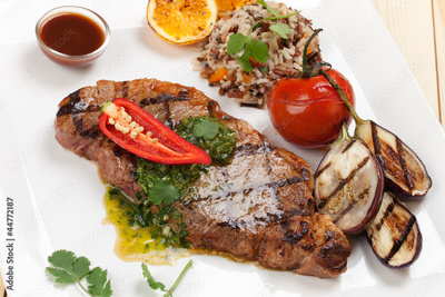 Piece of Medium Rare Steak with Spicy Herb Sauce