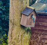 Parent Bluetit bird entering nestbox in early spring at Pickmere, Knutsford, Cheshire, UK