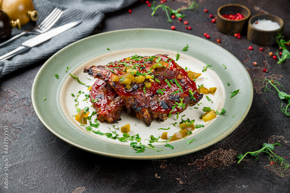 Barbecue pork ribs on beautiful plate on dark concrete table