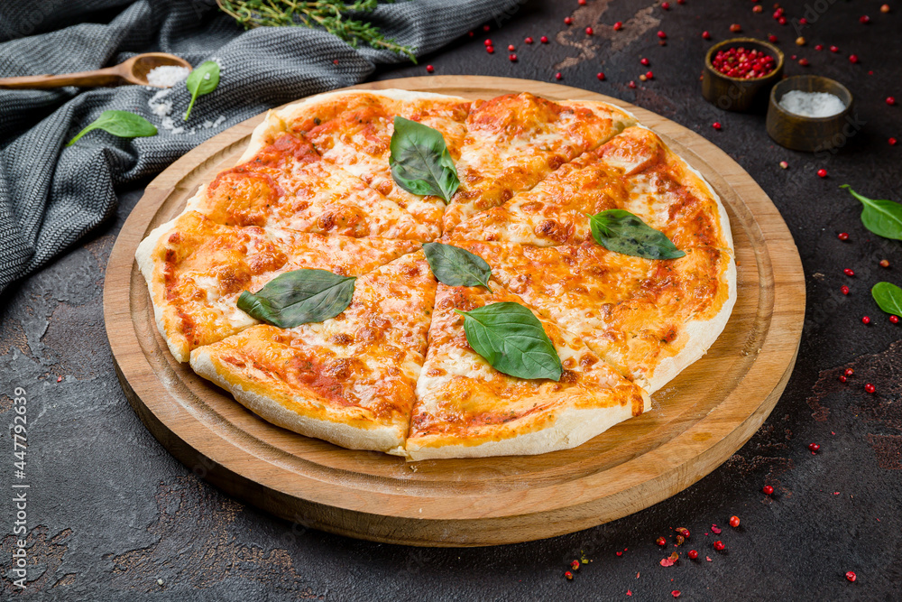 Italian pizza Margherita with basil on wooden board on dark concrete table