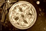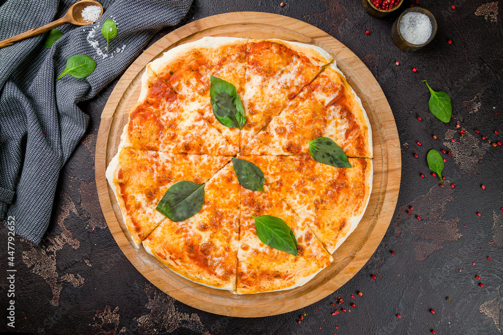 Italian pizza Margherita with basil on wooden board on dark concrete table top view