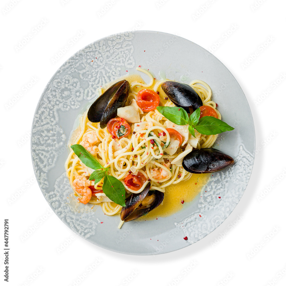 Pasta spaghetti with seafood, shrimps, mussels, tomatoes and basil isolated on white top view