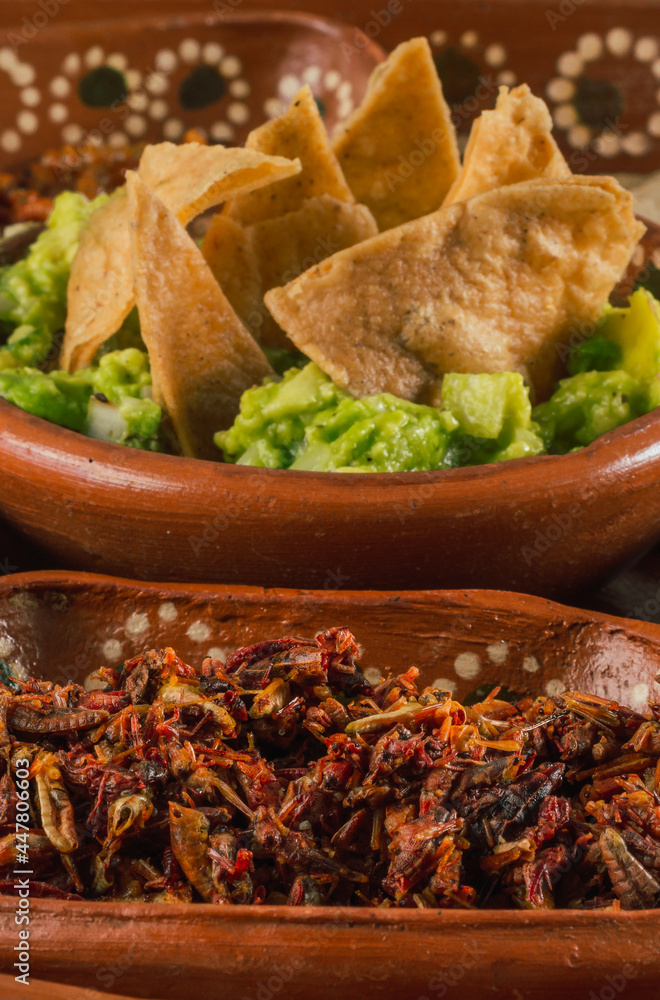 Fried grasshoppers with tortilla chips and guacamole, traditional Mexican food of pre-Hispanic origin, served on a clay plate.