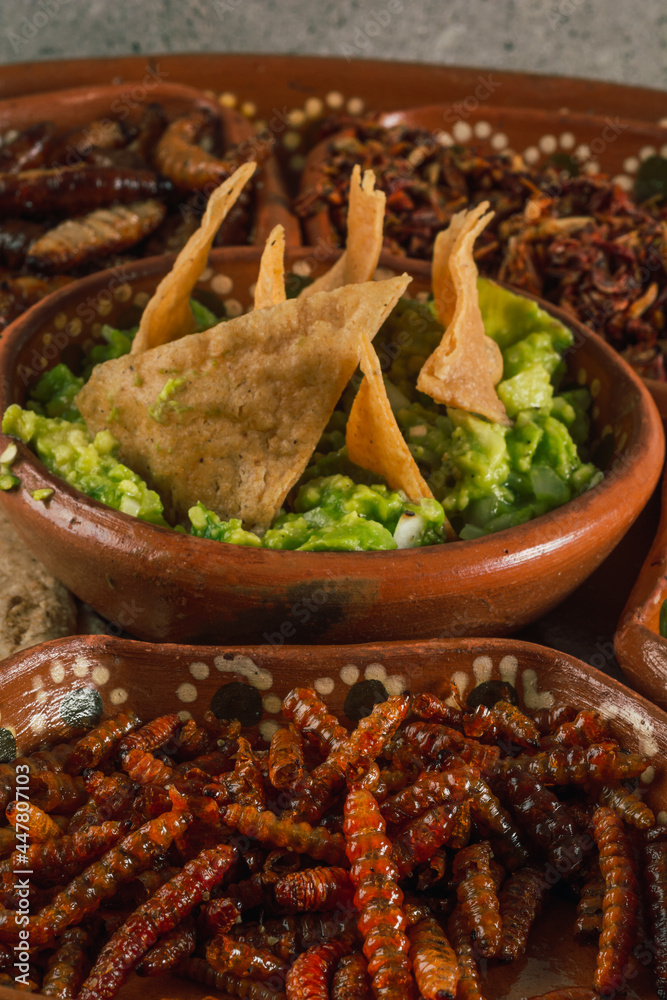 Fried maguey worms with tortilla chips and guacamole, traditional Mexican food of pre-Hispanic origin, served on a clay plate.