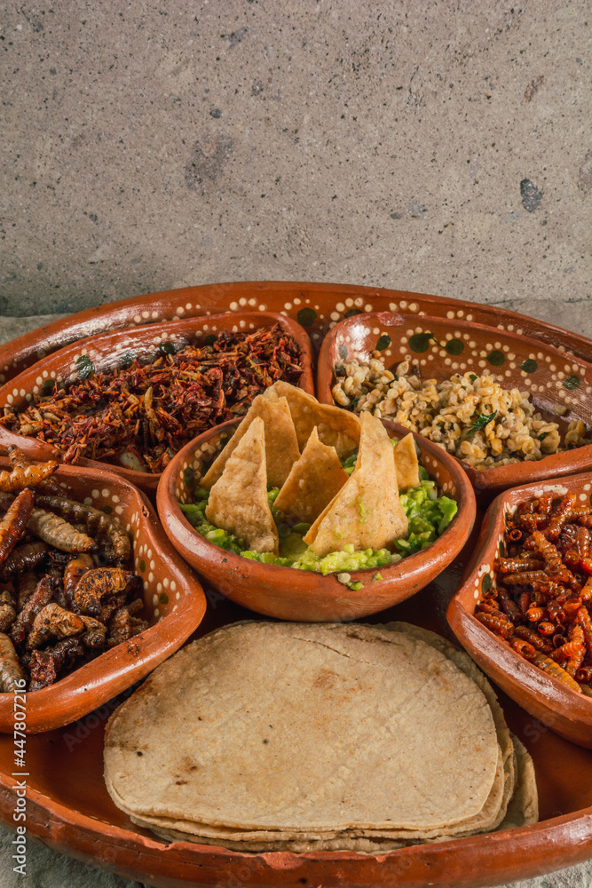 Plate with multiple edible insects, traditional Mexican food, among the dishes are escamoles, grasshoppers, chinicuiles, maguey worms, guacamole with tortilla chips and tortillas