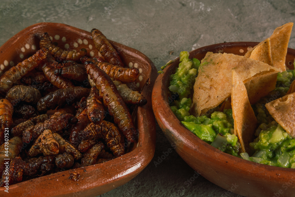 Fried chinicuiles with tortilla chips and guacamole, traditional Mexican food of pre-Hispanic origin, served on a clay plate.