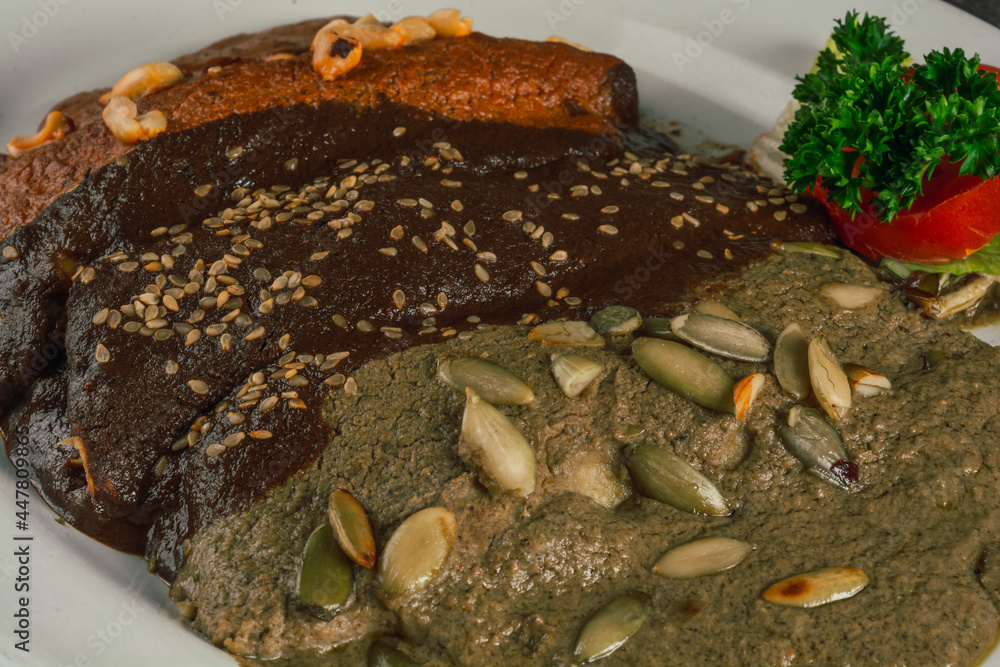 Enmoladas de encacahuatado, mole negro, pipian served on the same white plate, stuffed with chicken.