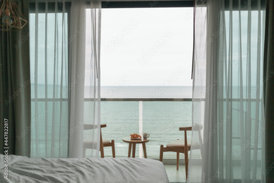 Table and chairs on the balcony with sea view. Summer travel concept.