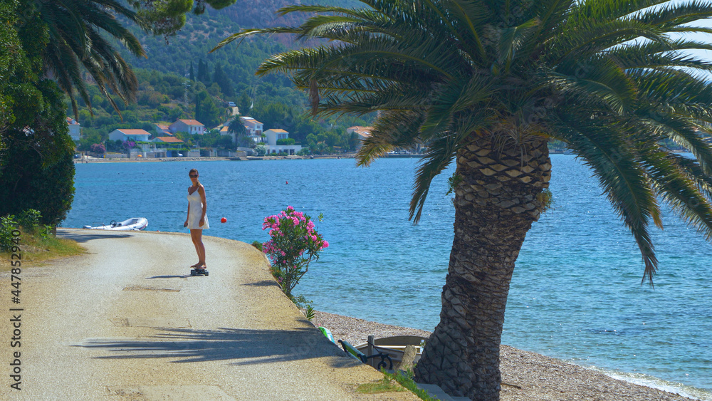 Active female tourist longboards on eskate while exploring beaches of Croatia.