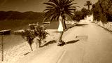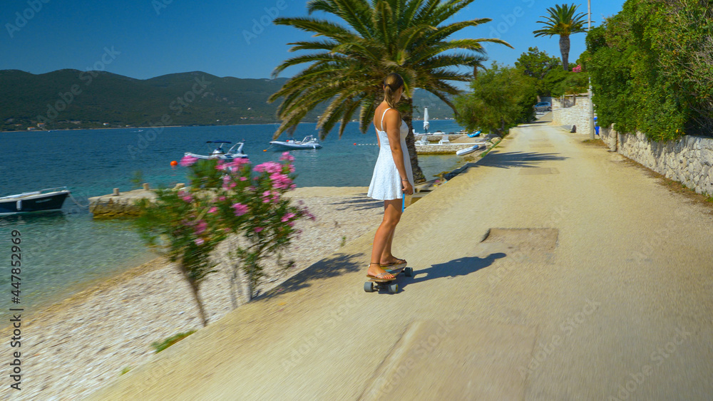 Woman in a sundress rides an electric skateboard along a coastal road in Croatia