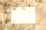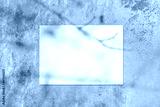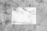 Empty white horizontal rectangle poster or card mockup with soft tree leaves and branches shadows on neutral light grey concrete wall background. Flat lay, top view
